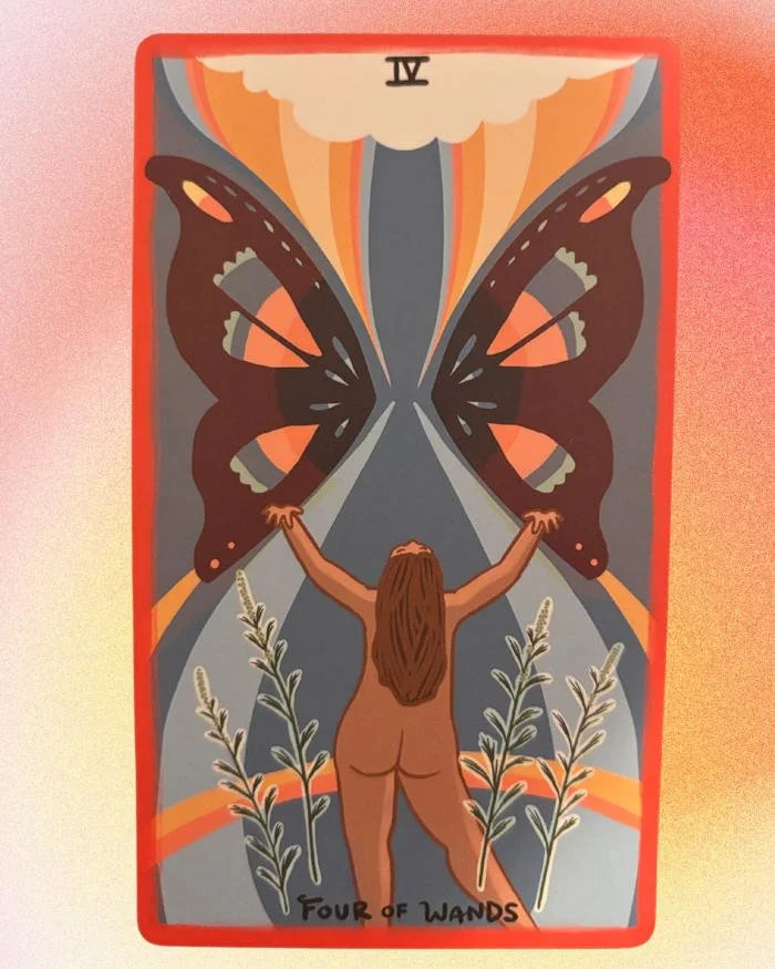 Closing out Aries season, we have the celebratory Four of Wands, representing the decan of Aries III from April 9/10 -April 18/19. This is such a sweet card. One that invites us to play and enjoy the good things in life. Classically, this card is tied to occasions, ones that call for us to throw on our fanciest ensemble and toast to love, achievements and new biological or chosen family members. It is a moment where we pause from our daily routine and look around to notice how lucky we actually are.